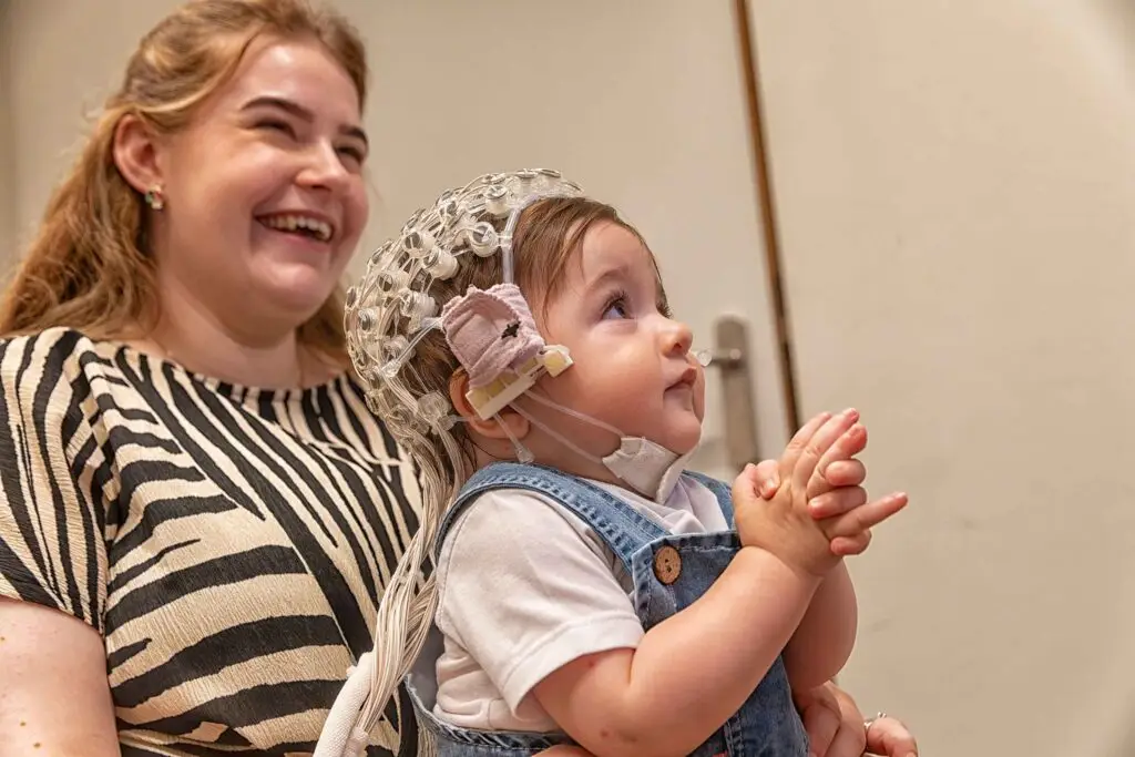 Om te begrijpen hoe uw kind de keuzes maakt in “het Sprookjesdorp”, meten we tijdens het spelletje de hersenactiviteit met behulp van EEG. Uw kind krijgt een “superheldenmuts” op: een soort comfortabele badmuts met kleine sponsjes erin. Deze meten de kleine elektrische stroompjes die door de hersenen worden gemaakt.